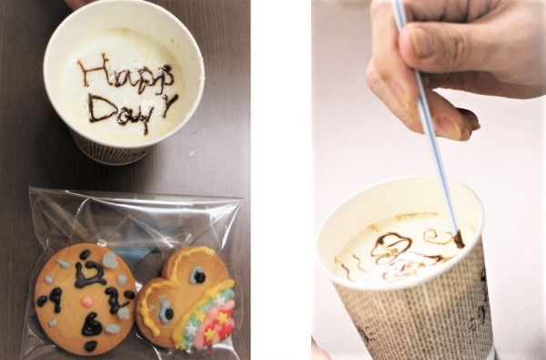 先日リワーク地域連携棟にて、アイシングクッキー&ラテアートの会を実施しました。ハート型や丸型のクッキーの上に、カラフルなアイシングペンやシュガーを用いて絵や文字をかきました!また、ラテアートは、コーヒーの上に泡立てた生クリームを乗せ、水に溶いた粉末のブラックコーヒーを細いストローの先端につけて、絵や文字をかきました。完成後は、素敵なクッキーとおいしいラテアートをおいしくいただきました!活動中は、「何をかいたらいいいかな」など迷いながらもみなさん工夫をしながらかき、「かわいい!」「こんなふうにかいてるんだ」など他者を誉め合う場面も見られ、活動を楽しむことだけではなく、他者交流の場ともなりました。
